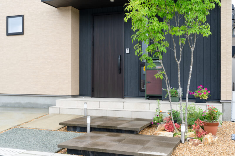 スタイリッシュな外観、ステップが広いゆったりとしたアプローチと植栽もお気に入りポイントとのこと。